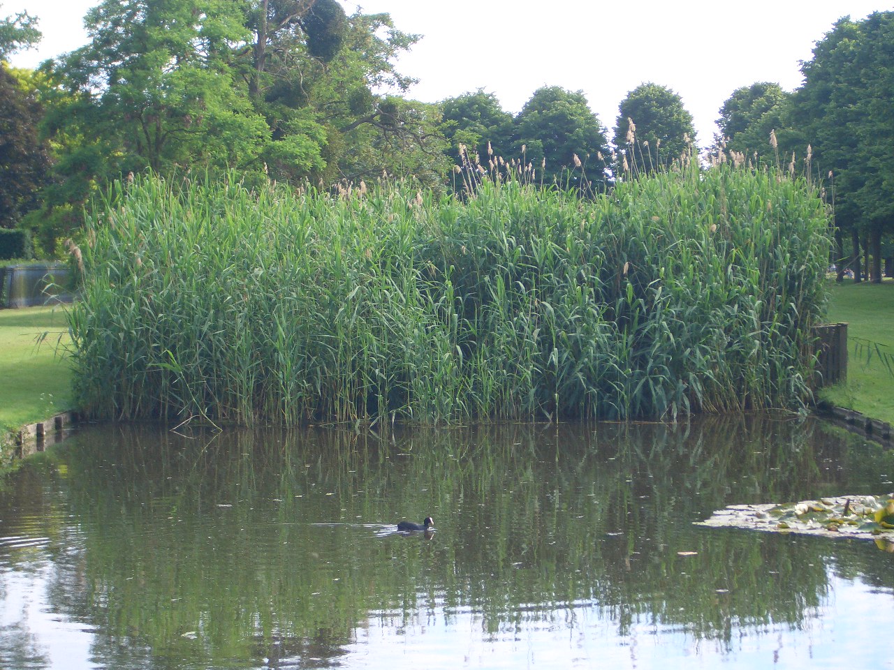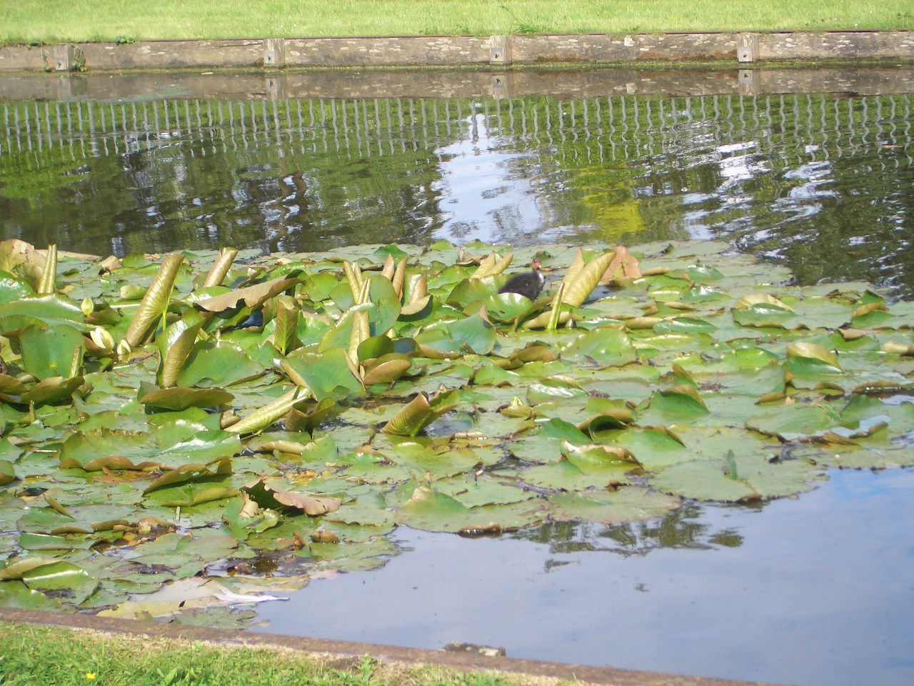 池にはアシとスイレンが植わってる。手前に黒い水鳥がいます。